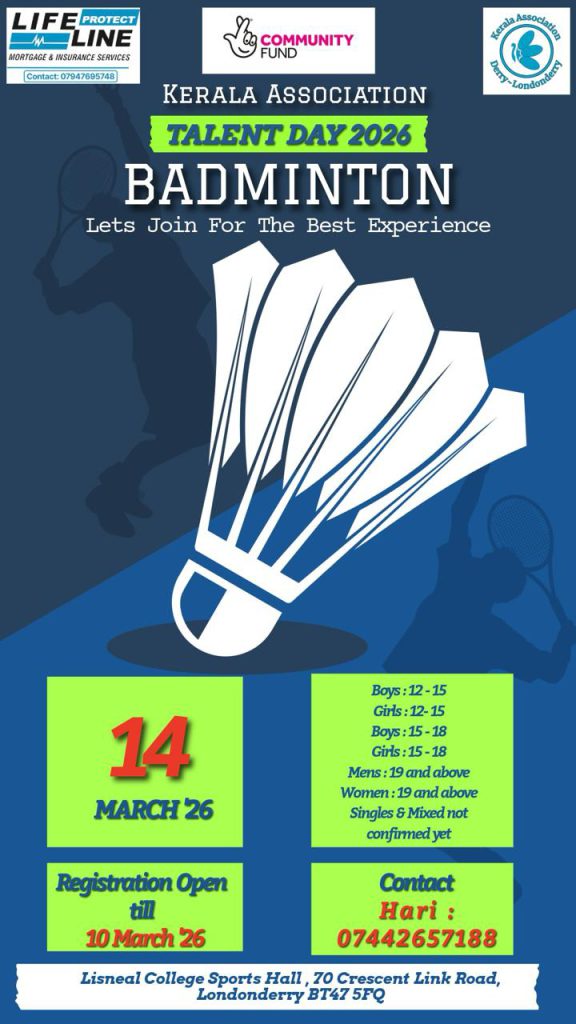 We are delighted to announce that the Kerala Association will be hosting a spectacular Talent Day event on Saturday, 14th March 2026 at the Lisneal College Sports Hall. This is your opportunity to shine and display your unique skills in front of our wonderful community.